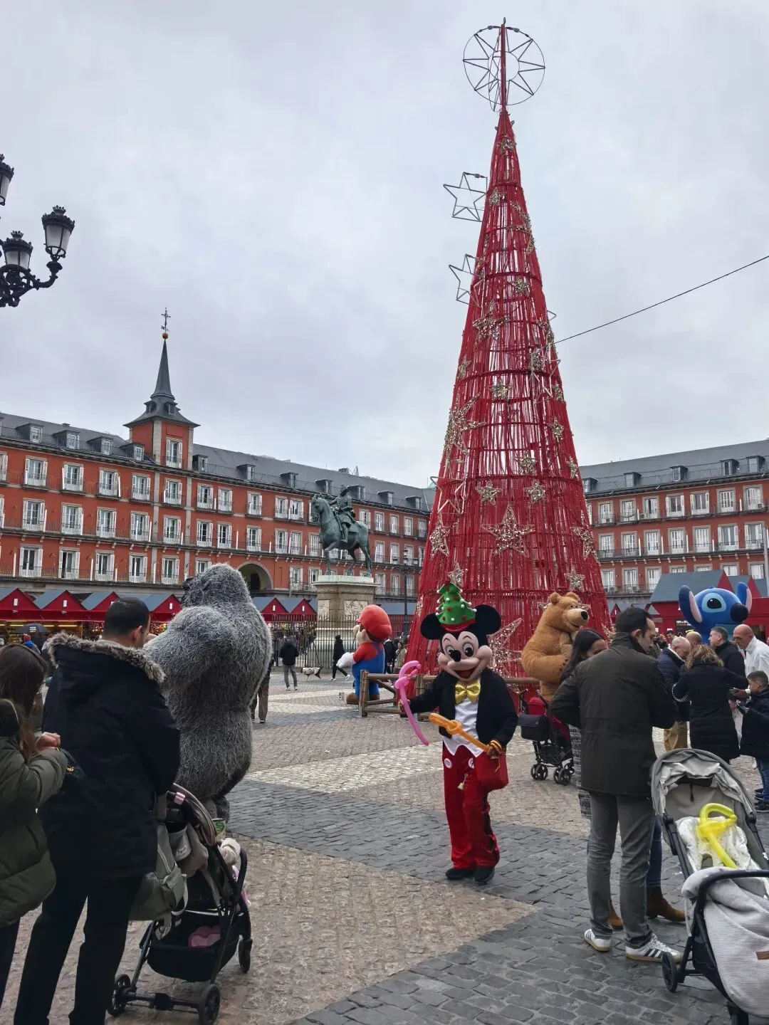 离开太阳门广场,家住马德里的导游熟谙马德里的大街小巷,他带领我们穿过几条街区,就来到了马约尔广场。马约尔广场历史悠久,它的空间尺度很大,东南西北共有九个可供进出的拱门。广场以四层建筑所形成的回廊组成,首层是柱廊,上面三层是住宅。马约尔广场因其举办过的历史活动而闻名,包括皇家庆典、斗牛表演和宗教审判。广场中央矗立着的菲里普三世的骑马雕像,气势非凡,仿佛在守护着这个城市的历史和记忆。广场中有出售纪念品和圣诞用品的商店,还有咖啡厅,是一个充满活力和生机的社交场所。我打开手机的摄像模式,将橙红色的巴洛克风格的建筑以及人们的欢声笑语尽收镜头。