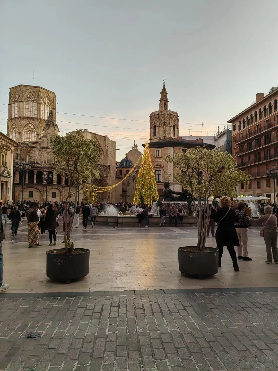 我们首先来到瓦伦西亚的圣母广场。圣母广场是瓦伦西亚的繁华中心,适逢圣母纪念日,广场上游人如织,摩肩接踵。夜幕降临,广场中央友谊喷泉上的灯光闪烁,广场北面的瓦伦西亚大教堂、教堂旁著名的八角形米格雷特钟楼、周边无助者圣母大教堂以及自治区政府大楼,这些融合着哥特式的庄严、巴洛克式的华丽以及罗马式厚重风格的建筑物,虽然风格迥异,但和谐共存,共同构成了圣母广场独特而丰富的画卷。在迷人灯光照耀下,我们似乎感受到瓦伦西亚的千年历史和文化。