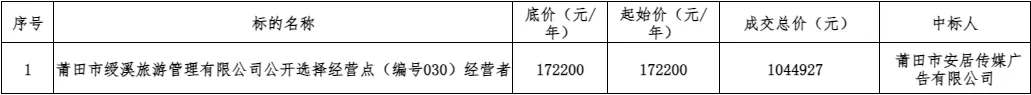 根据莆田市绶溪旅游管理有限公司公开选择经营点(编号030)经营者的相关招标流程,现就经营点(编号030)的招标结果予以公示,具体内容如下: