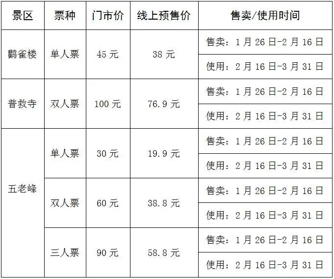 (2)水上列车专属优惠:2026年1月5日-12月31日,乘坐K237、8165、K2665次“水上列车”,并持有本人乘车之日起三日内已核销火车票(或电子凭证)的游客,凭本人车票及有效身份证件,可享受鹳雀楼景区、普救寺景区、五老峰景区三大景区首道门票半价优惠(夜场除外)