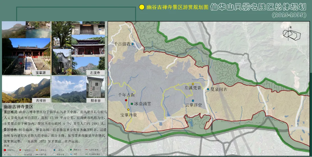 幽谷古禅寺景区,以“峡谷幽深、僧名远扬”为特色,完善古寺建筑群、优化游步道,培育峡谷观光农业,增加游憩节点,提供宗教体验、登山攀岩、康养休闲等服务。