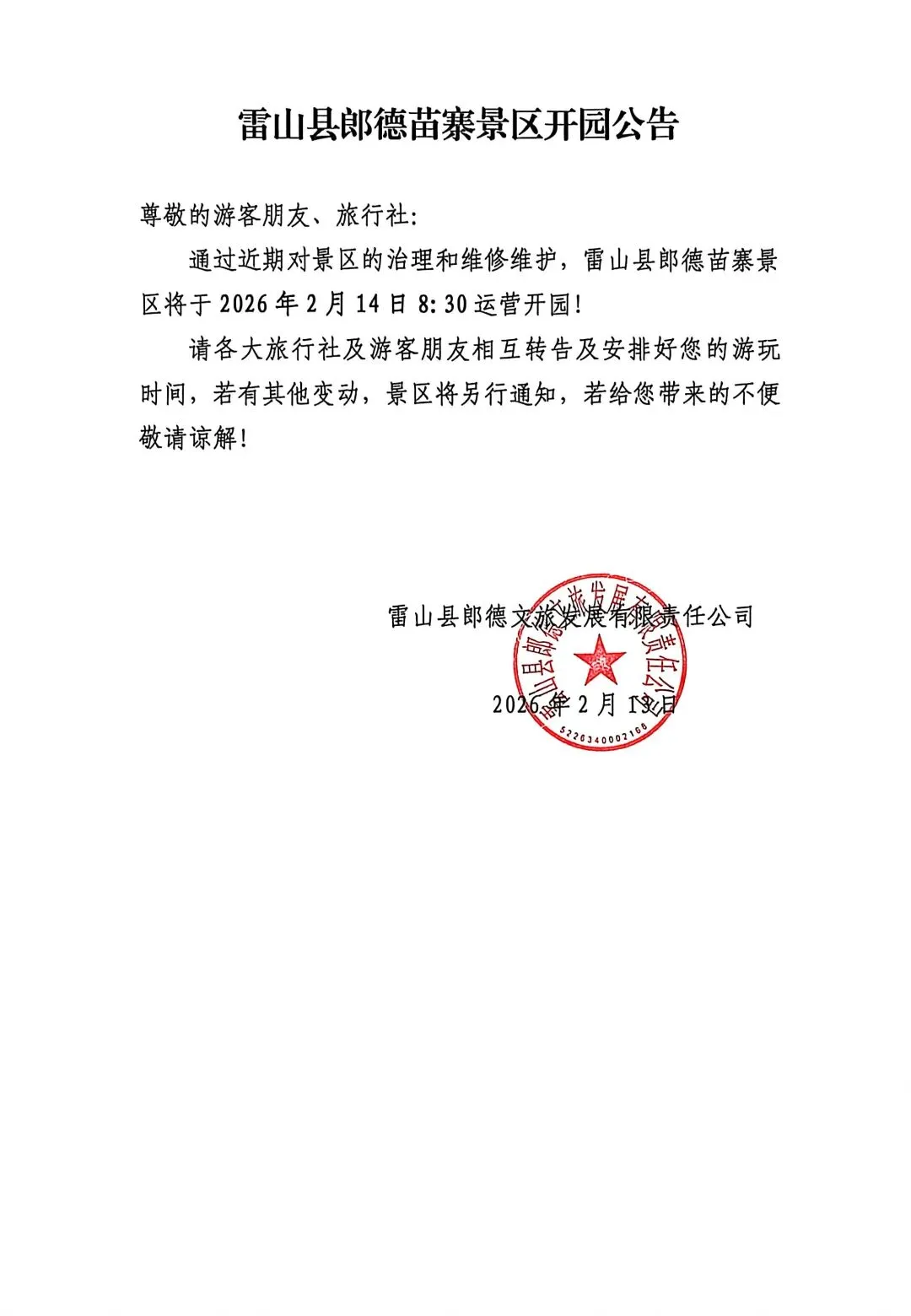 通过近期对景区的治理和维修维护,雷山县郎德苗寨景区将于2026年2月14日8:30运营开园!