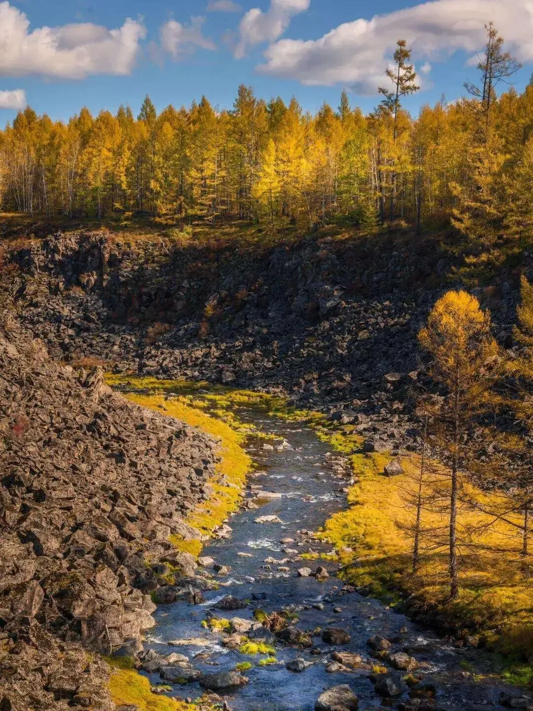 秋天把整座山烧成一块.调色板。不去.森林公园,.就开车在蘑.阿公路上瞎转,路两.边白桦林黄得透亮,火山石.堆.成.的村落飘着炊烟.。在不动河边停下来.,河水清得发蓝,岸边是夏天.火山喷发留.下的黑色熔岩,.冷与暖撞.在一起.。