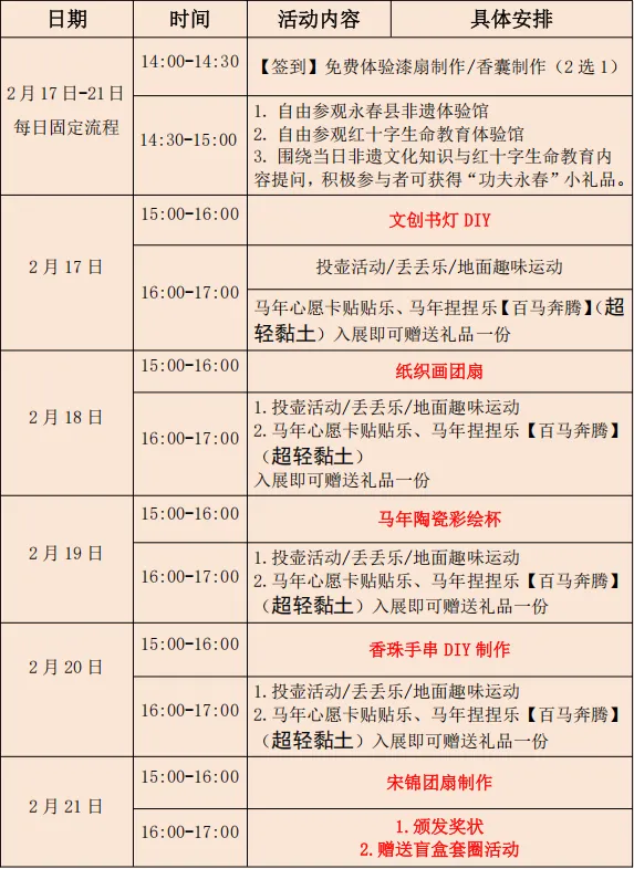 马年新春至,永春趣玩启!2026年2月17日-21日,永春旅游集散中心以“策马迎春乐游永春,非遗趣玩马年寻福”为主题,将永春非遗文化与马年民俗相融,打造新春趣味盛宴。非遗手作、互动游戏、惊喜福利轮番上阵,邀你和家人好友打卡集散中心,欢乐过马年,解锁新春新玩法!