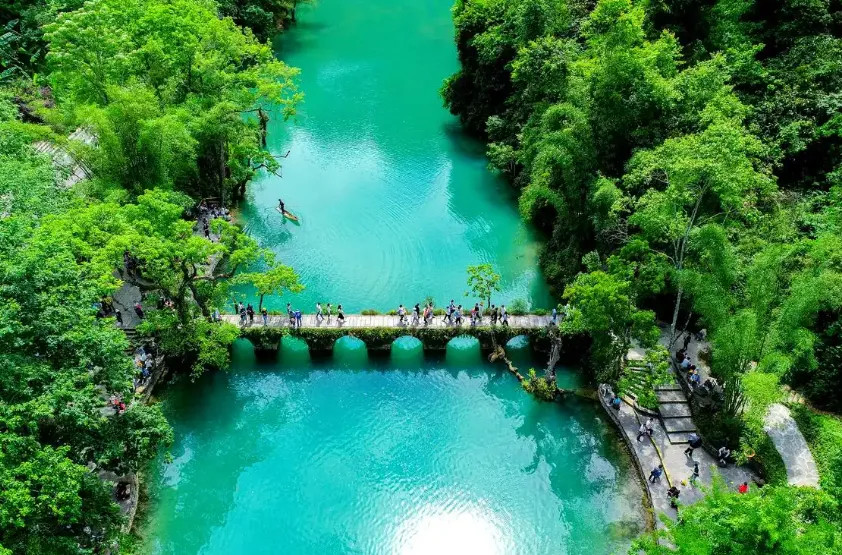 荔波|仙境秘境直奔小七孔(避坑:精华段步行,不买全程游船),卧龙潭蓝绿湖水似调色盘,小七孔古桥藏着“水作青罗带,山如碧玉簪”的诗意。早9点前入园避人流,沉浸式感受喀斯特山水的清冽,正如苗家所言“山养人,水润心”。