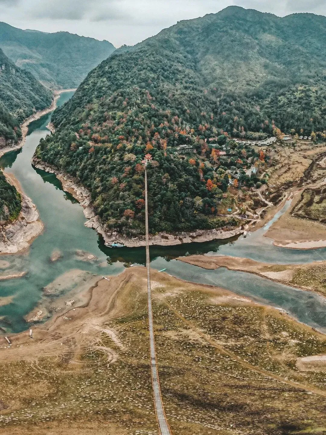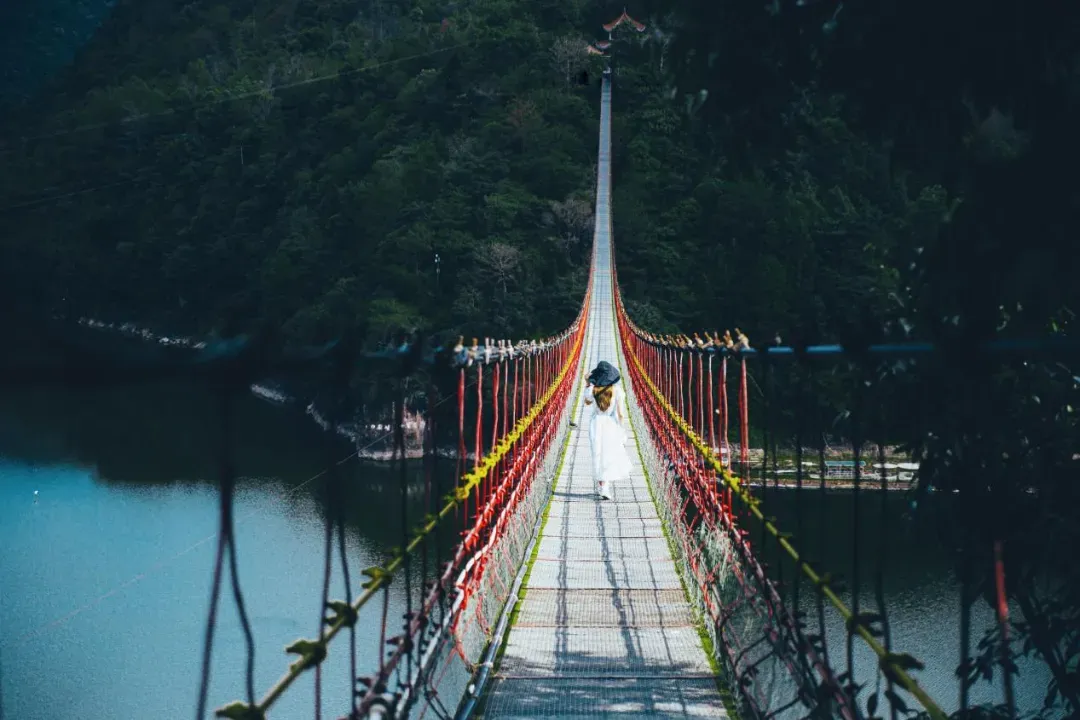 行走于白鹤山庄的358米长铁索桥,凌空湖面的震撼与步步惊心的刺激交织,风从耳畔掠过,仿佛乘风而行,寓意“顺风顺水”。乘竹筏游览白鹤峡十里画廊,两岸峭壁林立、植被茂密,湖光山色尽收眼底,在慢游中感受自然的馈赠,洗去一年的疲惫。
