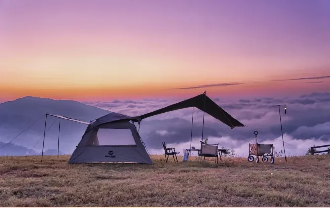 在仙池山安营扎寨,被高山云海星空包围,坠入梦乡。这是一场“向云端”的露营。城市可望不可及的日出、云海、繁星,在这开窗可见。