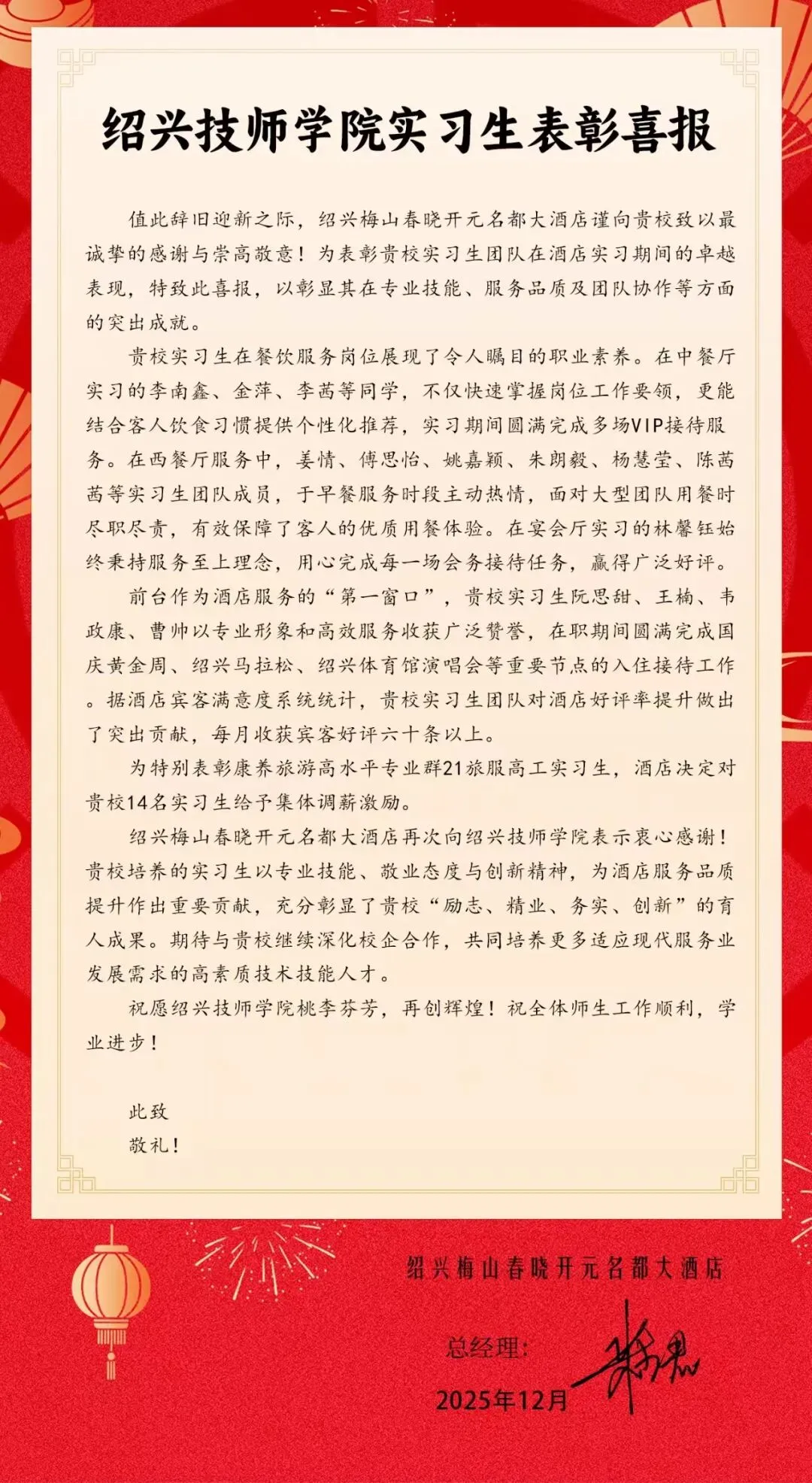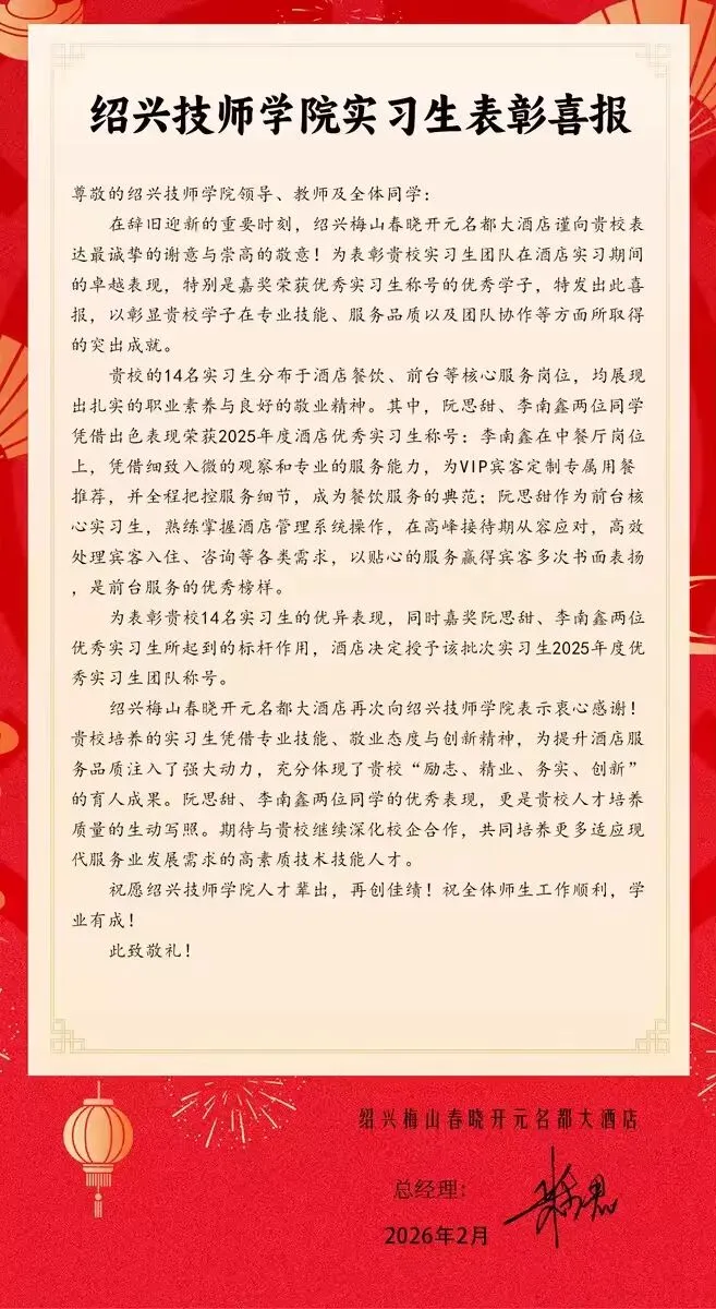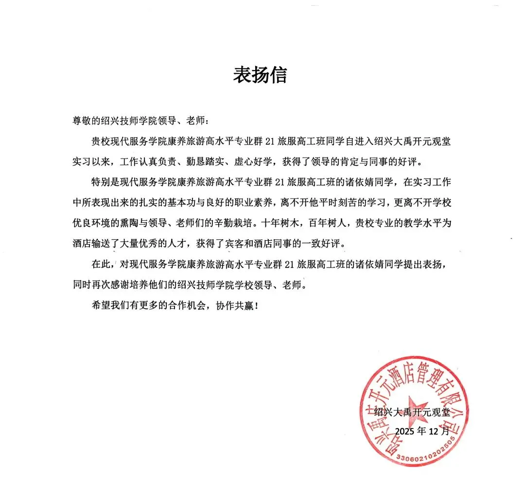 绍兴大禹开元观堂酒店发来感谢信与表扬信,表彰我校21旅服高工班诸依婧等实习生热情周到的服务态度与严谨细致的工作作风。