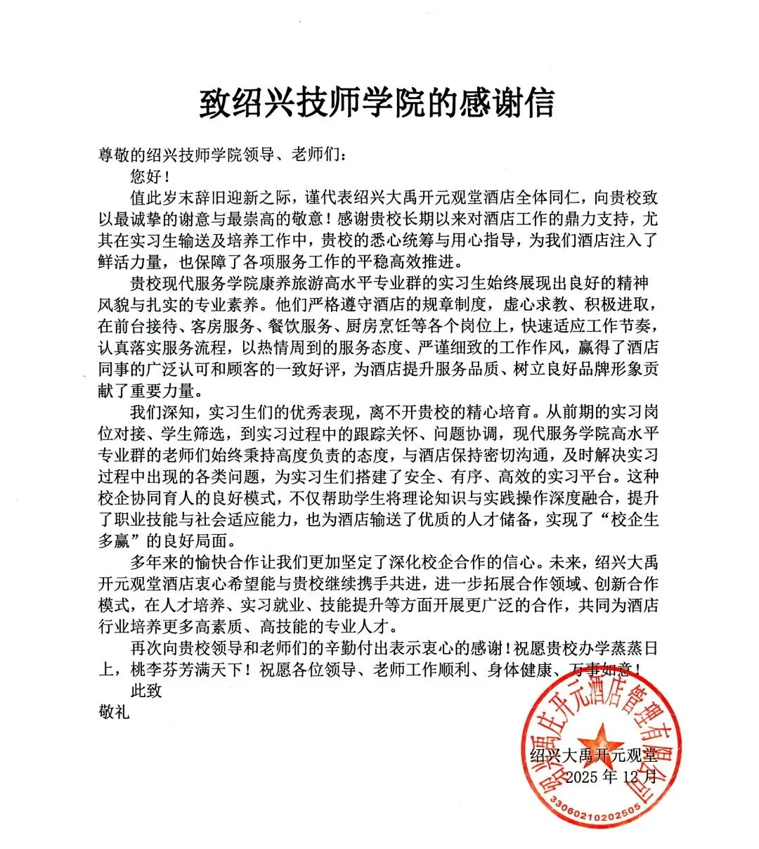 近期,绍兴大禹开元观堂酒店、绍兴梅山春晓开元名都大酒店、嵊州开元名都酒店等多家合作单位相继发来感谢信与表扬信,对我校现代服务学院康养旅游高水平专业群实习生的优异表现给予高度评价。