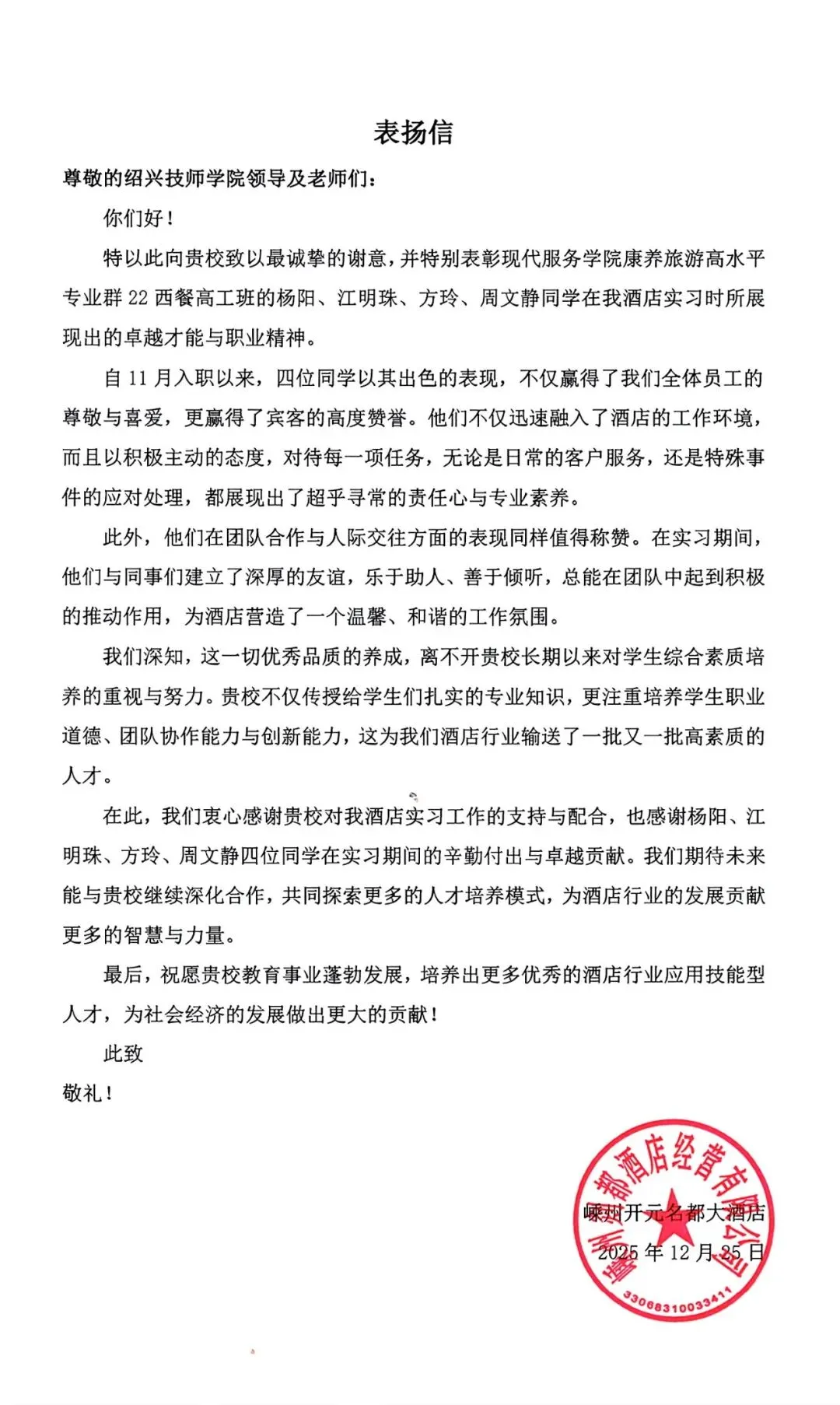 嵊州开元名都酒店发来表扬信,对22西餐高工班杨阳、江明珠、方玲、周文静四位同学的专业素养与职业精神给予高度认可。