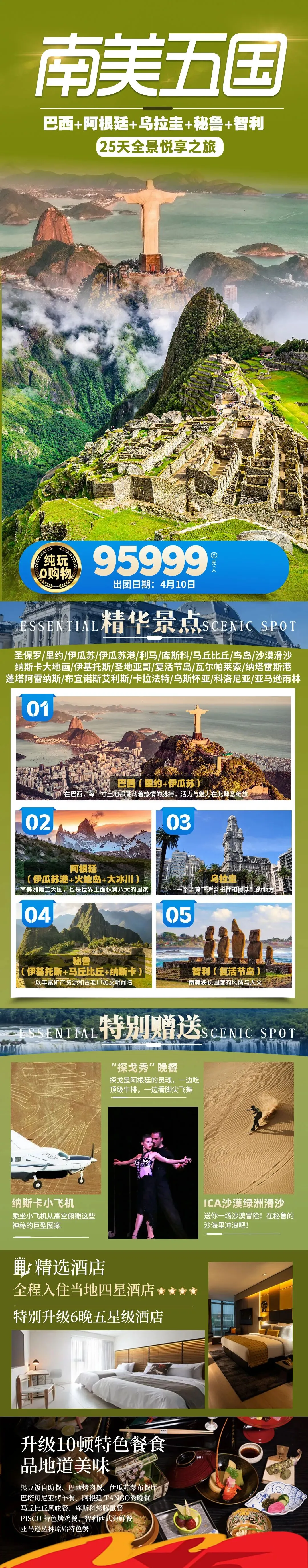 🌸【十大精选美食】巴西国菜黑豆饭自助餐、巴西烤肉餐、伊瓜苏瀑布餐厅、巴塔哥尼亚烤羊餐、阿根廷Tango秀晚餐、马丘比丘风味餐、库斯科烤豚鼠餐、Pisco特色烤鸡餐、智利西式海鲜餐、亚马逊丛林原始特色餐[庆祝]全程四星酒店+6晚五星级酒店