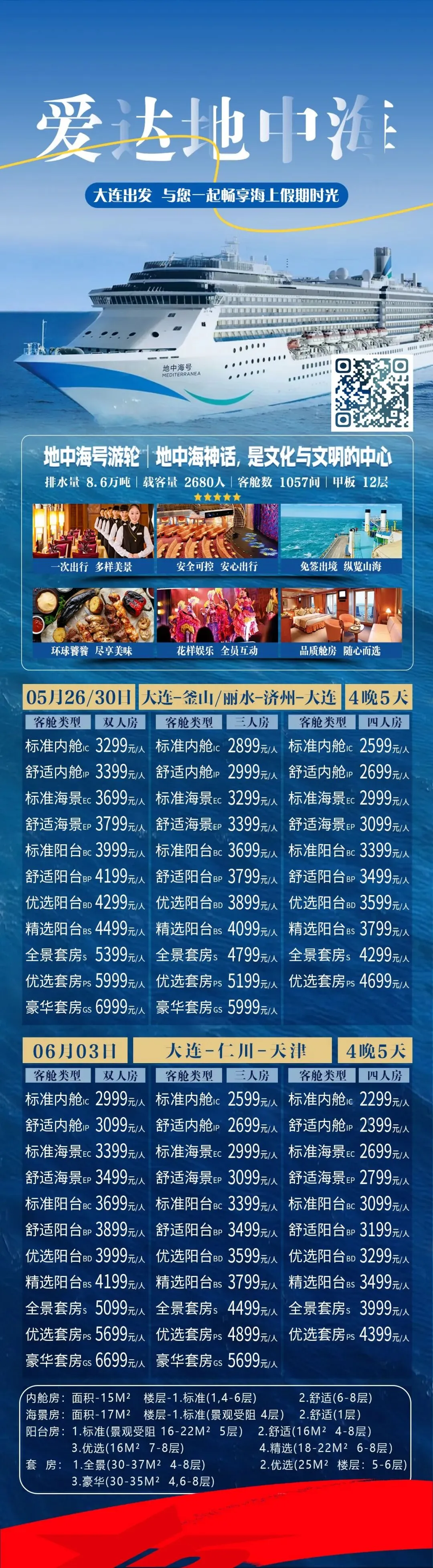 内舱四人仅 1500 / 人起!阳台房也才 3k+