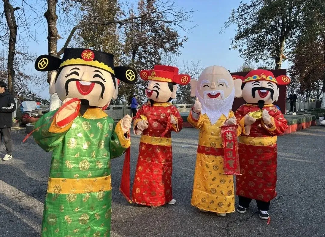 五位财神爷携红包、金元宝巧克力、糖果巡游派好运,合影喊出口号 “苏仙岭送福,2026 为福加马”,财运福气双丰收。