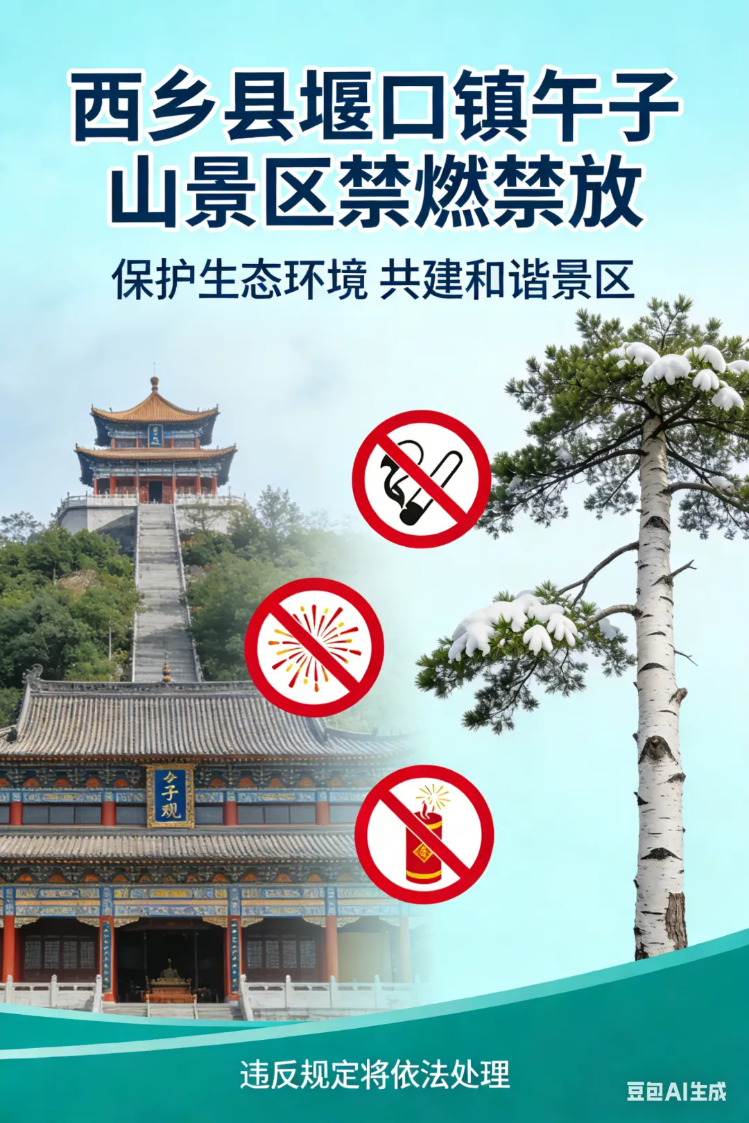 6.安全须知:景区地处林区,禁止吸烟、禁止携带大香、高香、鞭炮、孔明灯等进入景区,禁止沿途焚香烧纸,严防森林火险;请各位游客文明祭拜,午子山顶观高峰时段,服从工作人员引导,停止沿路焚香烧纸;顶观大殿内禁止焚香烧纸,进入大殿内祭拜,文明有序,不造成人员大面积聚集,如果您在参观游览过程中有需要,请及时与我们联系 (景区救援电话:0916-6371154)