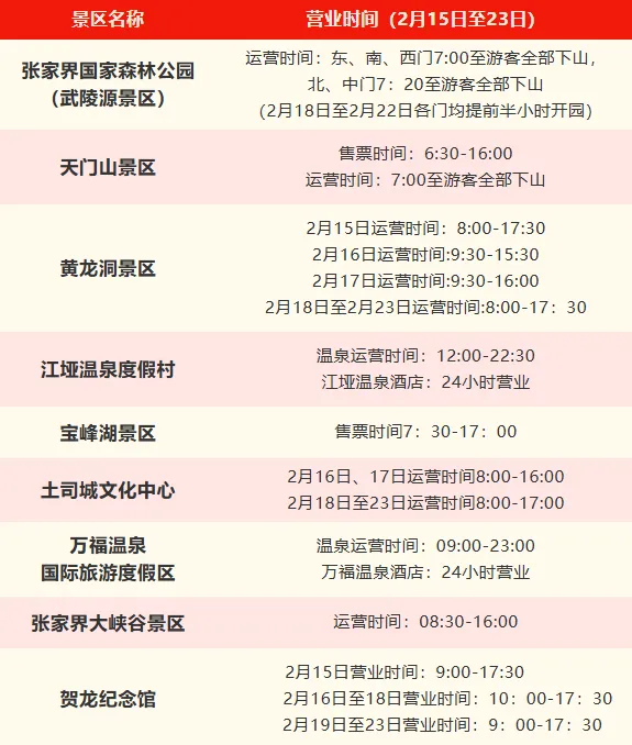 张家界部分景区春节期间营业时间来了!