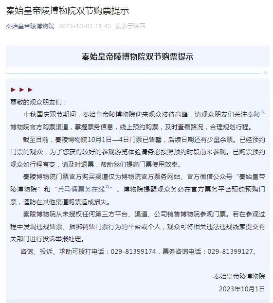 秦始皇帝陵博物院微信1日发布提示:秦陵博物院10月1日—4日门票已售罄,后续日期还有少量余票。已经预约门票的观众,为了您获得较好的参观游览体验请务必按照预约时段前来参观。已购票预约观众如行程有变,请及时退票,帮助我们提高门票使用效率。