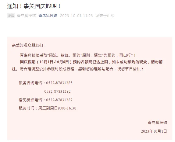 青岛科技馆微信1日发文表示,国庆假期(10月1日-10月6日)预约名额现已达上限,如未成功预约的观众,请勿前往。