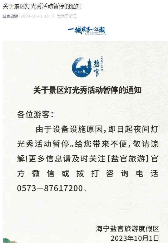 10月1日,盐官旅游微信发布通知称,由于设备设施原因,即日起夜间灯光秀活动暂停。