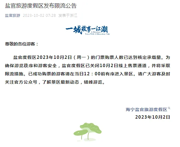2日早间,盐官旅游微信发布限流公告,盐官度假区2023年10月2日(周一)的门票购票人数已达到核定承载量。为确保游览秩序和游客安全,盐官度假区已关闭10月2日线上售票通道,并将采取限流措施。