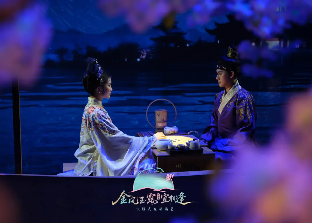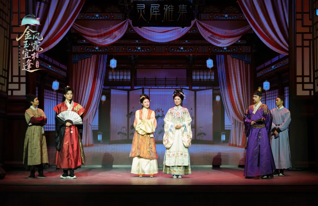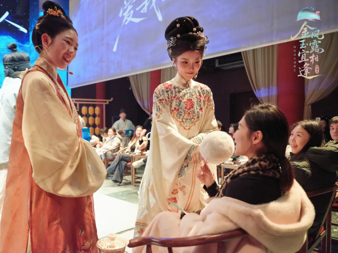 作为济南“曲山艺海”的文化地标之一,明湖居此次并非简单重启,而是通过顶尖的沉浸式演艺实现活化升级。《金风玉露宜相逢》深度融合戏楼本身的古典空间美学,运用现代舞美科技与精巧的动线设计,打破舞台与观众席的界限,通过“全程入戏”的互动模式,让百年建筑焕发新生,成为可游、可玩、可感、可拍的文旅消费新场景。