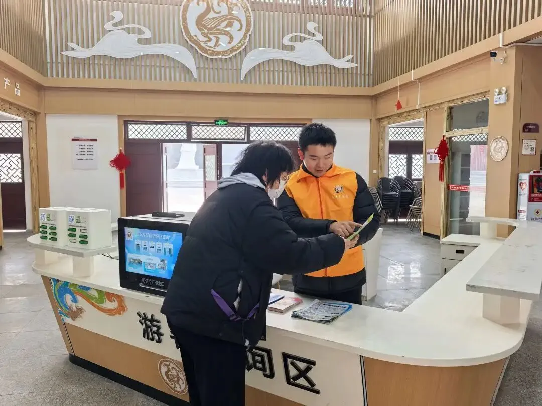 志愿者们身穿黄马甲,以饱满的热情、耐心的态度,驻守在引导台前,化身游客的“贴心导航”。无论是景区地图、开放时间、门票政策等基础咨询,还是游览路线规划、卫生间与停车场位置指引,他们都细致解答、不厌其烦;面对老年游客、残障人士等特殊群体,他们手把手引导、对接,用贴心服务化解游客的出行难题。