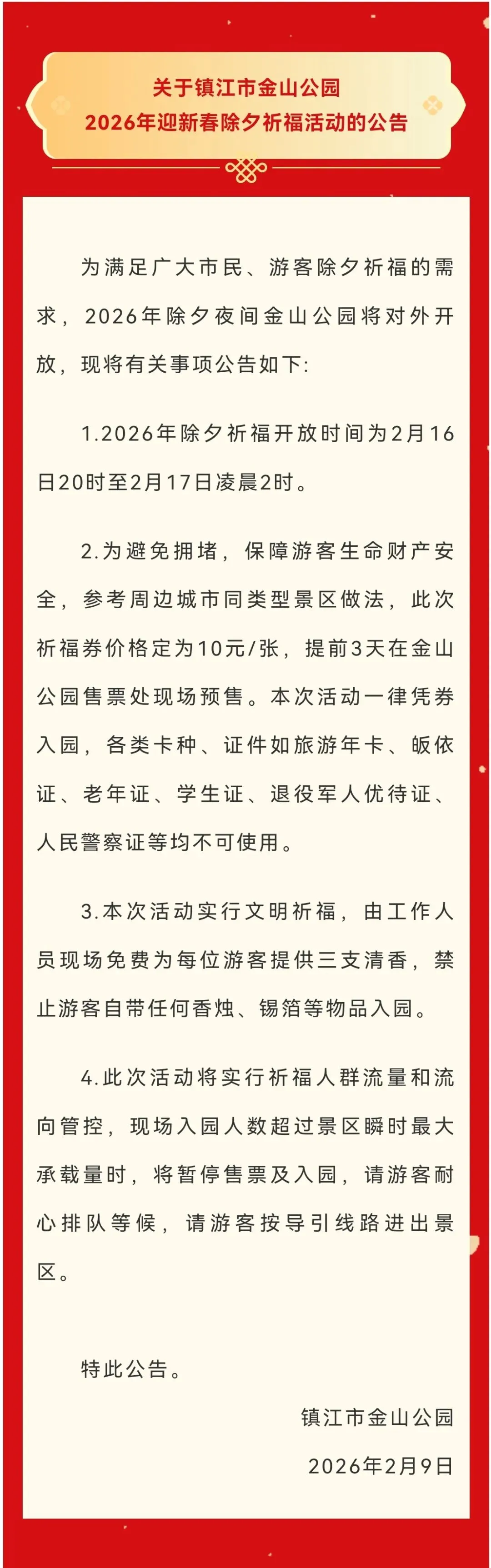 2.线下兑换:中奖用户必须于2026年2月16日15:00前,凭“镇惠玩”账户中的电子祈福券至金山景区游客服务中心进行兑换,领取实体入场凭证。