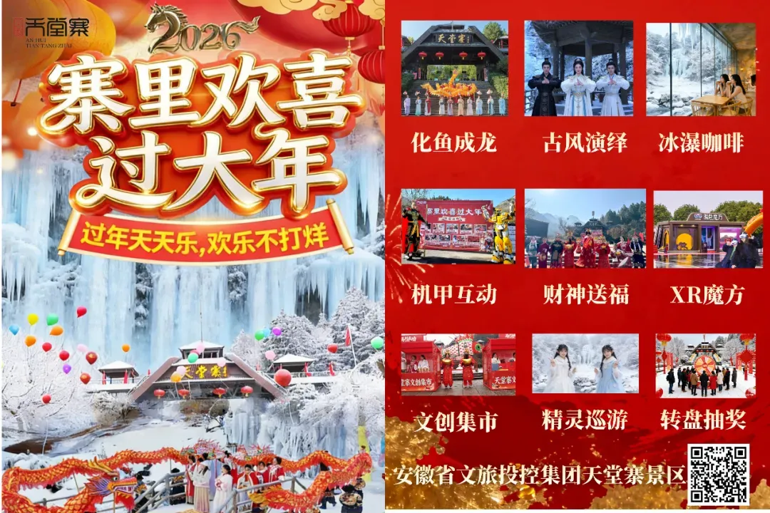 岁启新程,年味渐浓,安徽省文旅投控集团天堂寨景区携多重新春好礼与趣味活动,邀您赴一场山水间的团圆盛宴! 赏冰瀑奇景、观非遗演艺、做手工年味、住特色酒店、购地道年货,新年期间,欢乐不打烊,把新年仪式感拉满!