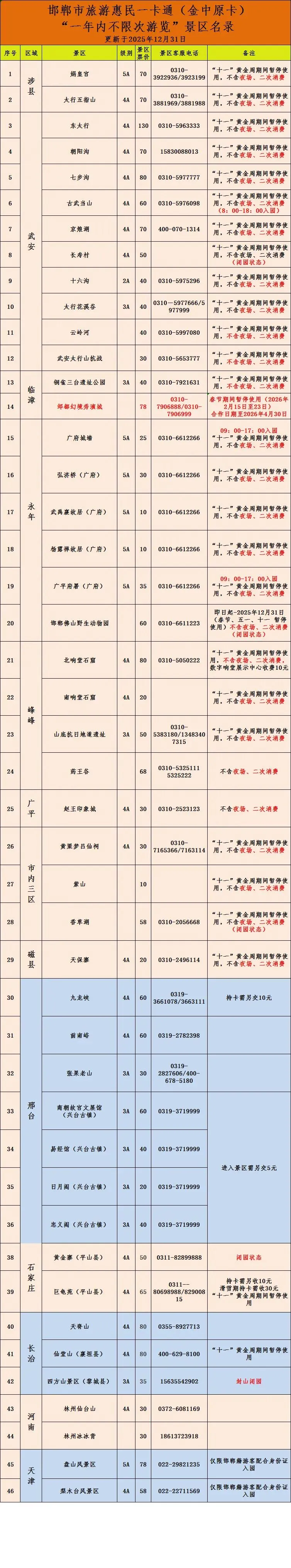 【最新最全】“邯郸旅游年票”免费不限次景区名录(更新于2025年12月31日)及自助购买激活方式