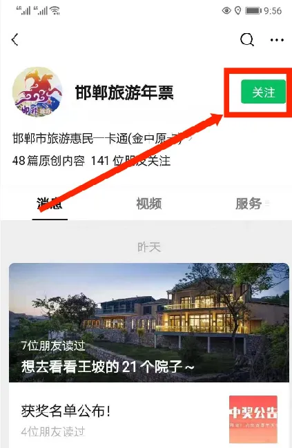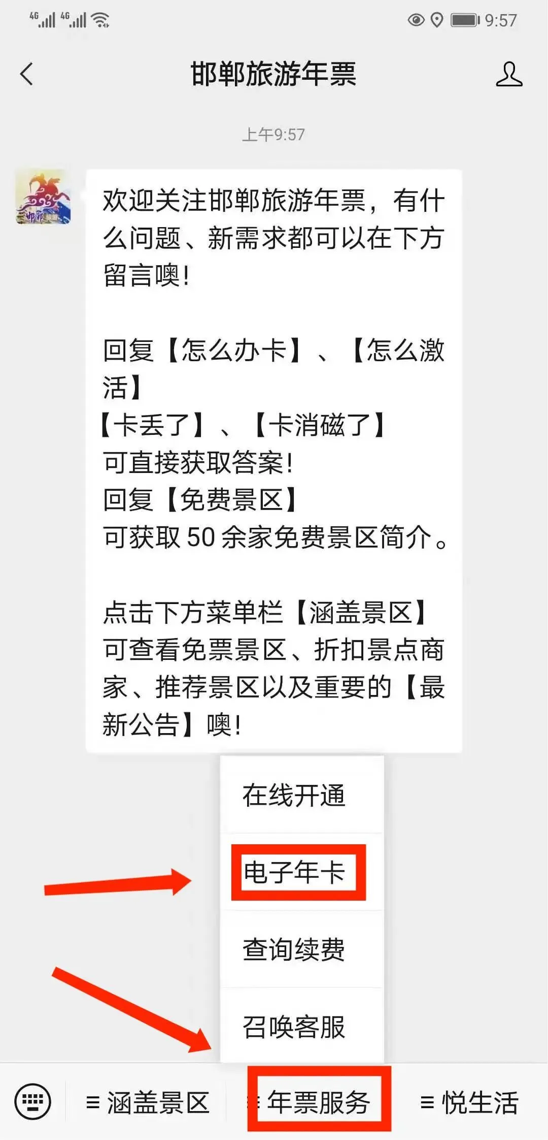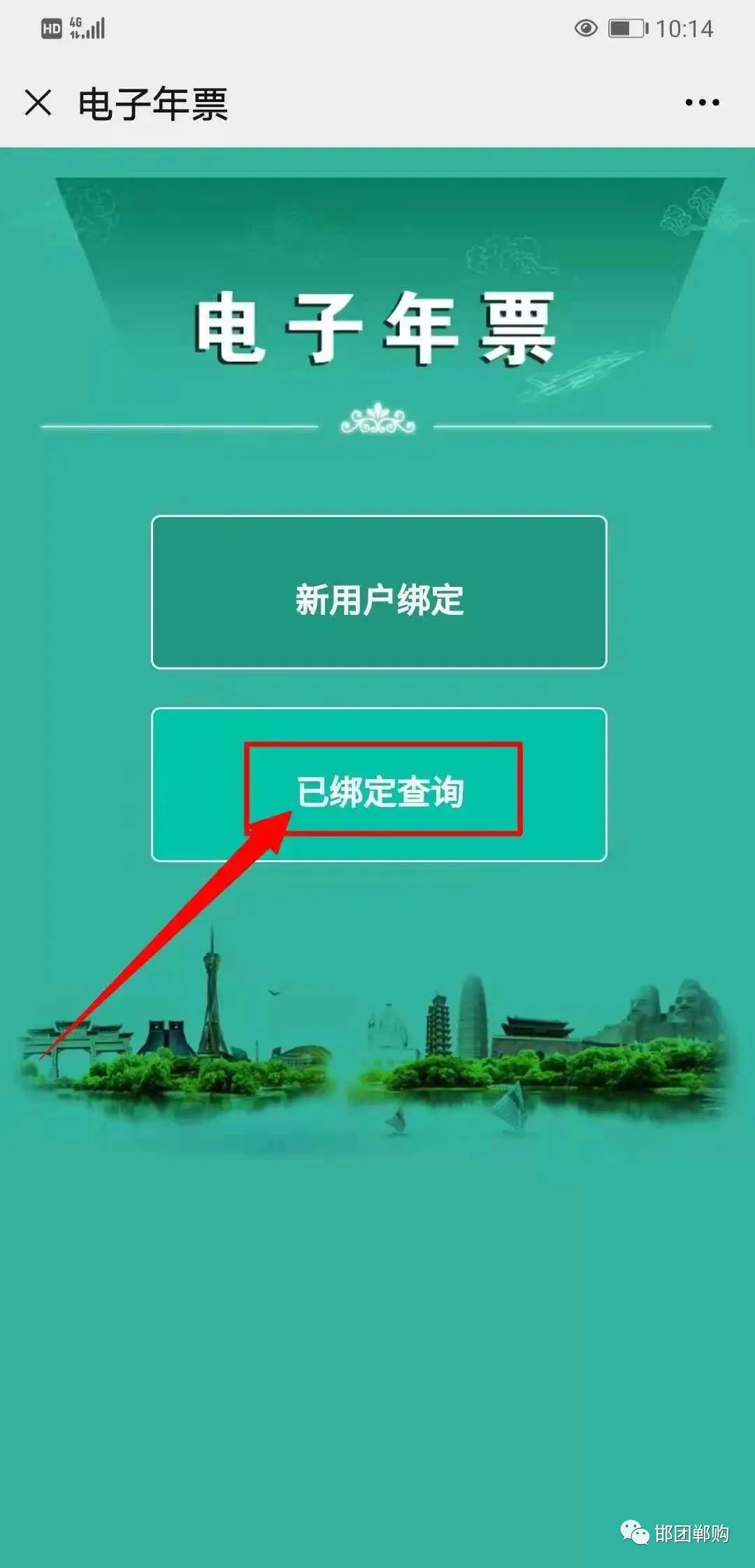 自助开通 旅游一卡通步骤 注:年卡开通后次日生效。 点击微信公众号“邯郸旅游年票”中的菜单栏“年票服务”→“电子年卡”选择“已绑定查询”即可重新调取,另外电子年卡(二维码)当天有效。 关注公众号,长按识别下方二维码进行关注; 或者打开手机微信,搜索公众号“邯郸旅游年票”,点击“关注”,关注后进入公众号。