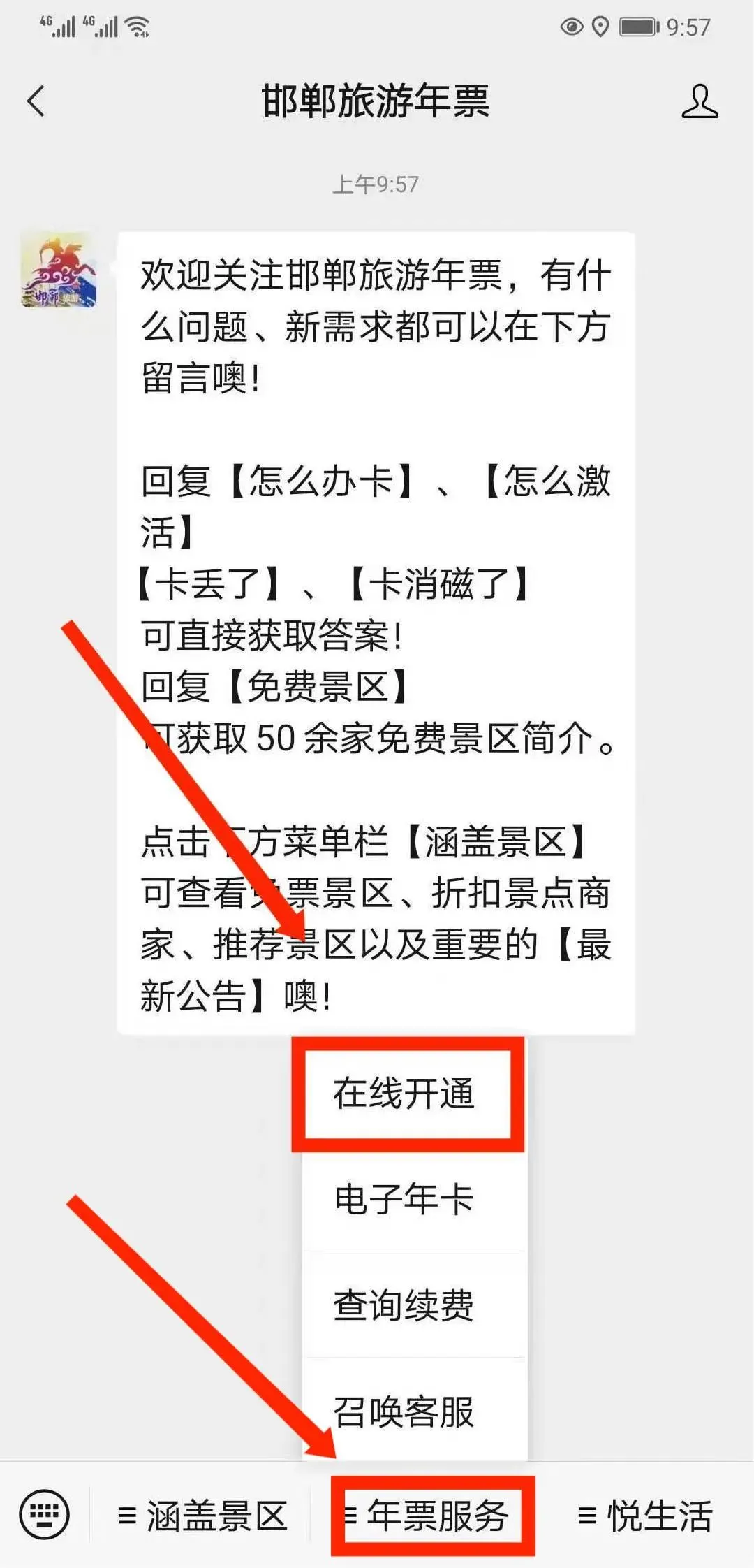 点击微信公众号“邯郸旅游年票”最下面菜单栏【年票服务--在线开通】,根据提示操作,填写相关身份信息,上传本人身份证正面照片或头像提交开通。