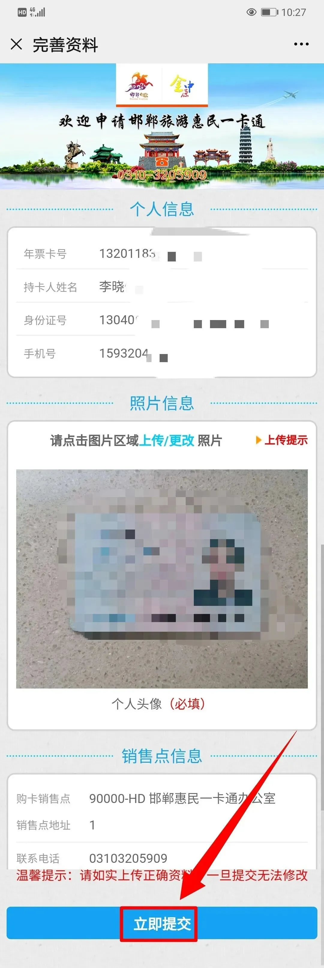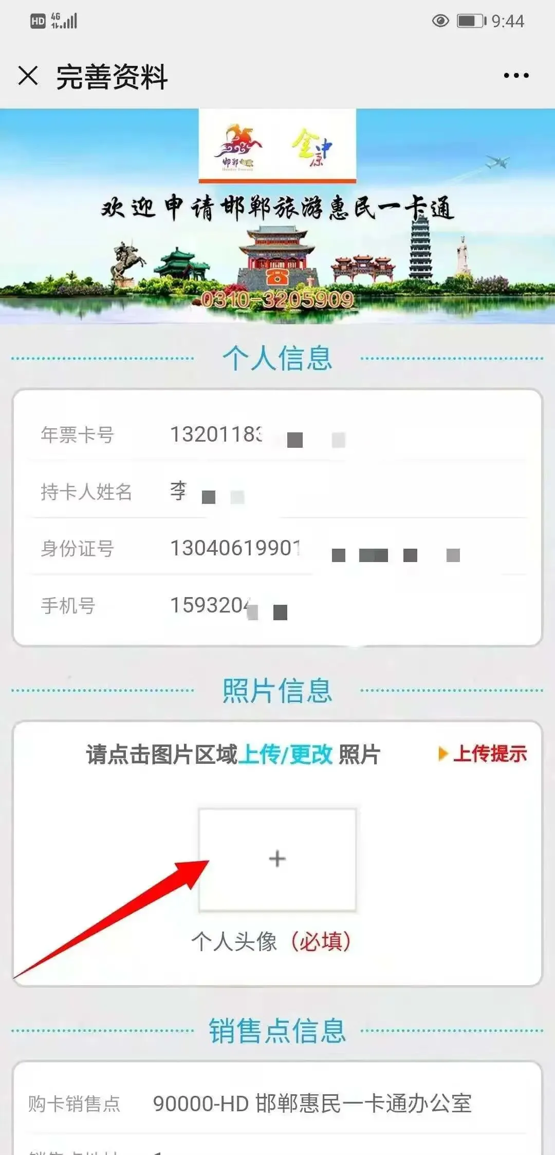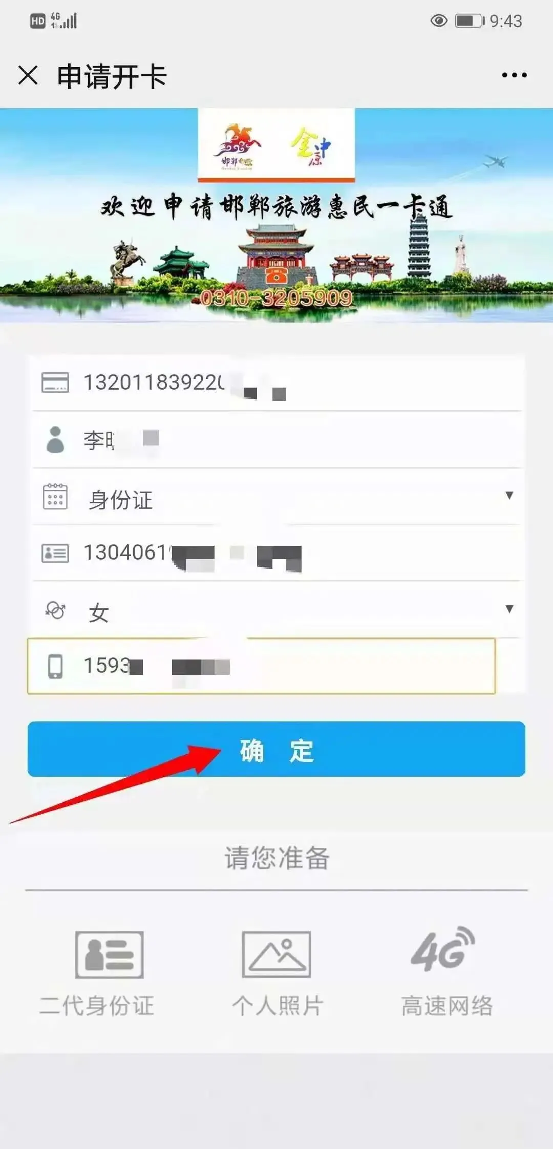 01输入邯郸旅游惠民一卡通(金中原卡)的卡号、姓名、身份证号和手机号点击“确定”;