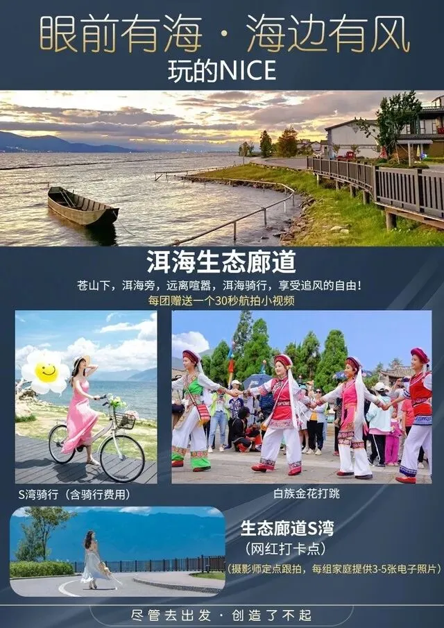 前往海天一色的【生态廊道S湾】(网红打卡点),零距离贴近洱海,大家可以在这里自由拍照,疯狂打CALL朋友圈(摄影师定点跟拍,每组家庭提供3张电子照片),沿着洱海来一场代表激情与浪漫的【S弯骑行】(含骑行费用)沿途欣赏苍山洱海边的田园风光;参观【白族古村落】,打卡【弓鱼洞遗址】过去洱海边的白族人民,世代以打鱼为生,桃源村古渡码头便是扬帆起航的地方,也是带着满船渔获归家的温暖港湾。洱海中最著名的“弓鱼洞”就位于此处;跟白族金花一起来一段传统【白族打跳】白族善歌舞,喜打跳。由白族歌舞传承人金花、阿鹏带着大家在洱海边一起打歌,一起跳舞,也是让人难忘的旅行经历。载歌载舞,欢快淋漓,治愈的旅游体验,为大理之行划上了一个圆满句号