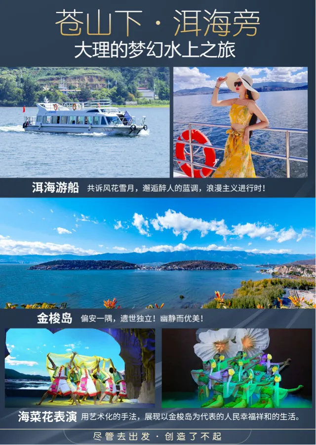 下午乘坐【游船】登岛【金梭岛】。大理金梭岛龙宫素有 “洱海明珠”之称,因岛形像一只织布用的梭子而得名,在青翠的苍山和风光秀美的洱海之间,显得尤其妩媚动人。【龙宫灯光秀】进入龙宫,仿佛打开了另一个神奇的世界,五彩斑斓的灯光科技感十足,走在里面如同探险一般伸手就能碰到悬挂在半空中的石柱,其形状与纹路都美得让人心醉,有的晶莹剔透,有的泛着多种彩光。观赏【海菜花表演】《海菜花》以只能生长在洁净的海菜花为主题,以金梭岛渔民世世代代在洱海打鱼、捕捞、航运的生活习俗为依托,用艺术化的手法,展现了以白族人民幸福祥和的生活,以及保护洱海、爱护环境,人与自然和谐共处的美好画卷。