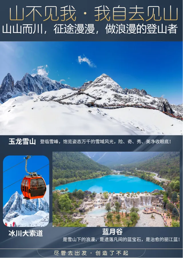 酒店早餐后,静静的穿梭在这道充满故事的古城墙内,游览【大理古城】(停留时间120分钟):游走在大理古城的大街小巷里,听风拂过青苔绿瓦,千百年来,这里商贾如织,茶马互市,静静演绎岁月沉淀的韵味。游览大理古都御园,集大理之美,垒苍山之秀,揽洱海之波,亭台水榭,古韵悠长。午餐后,乘车赴丽江,乘坐【冰川大索道】游览纳西族的神山【玉龙雪山】(温馨提醒:如遇黄金周或旺季玉龙雪山大索道流量限制,我们将为您更改为云杉坪索道,并现退差价),从海拔3000米的草甸出发,穿越高大挺拔的各种松林杉树,到达海拔4506米高的雪山冰川,欣赏大自然恩赐的美景(游览约90分钟,不含排队及乘车时间)。游览高原上璀璨明珠【蓝月谷(电瓶车60元/人已含)】,体会大自然的神奇与壮美。