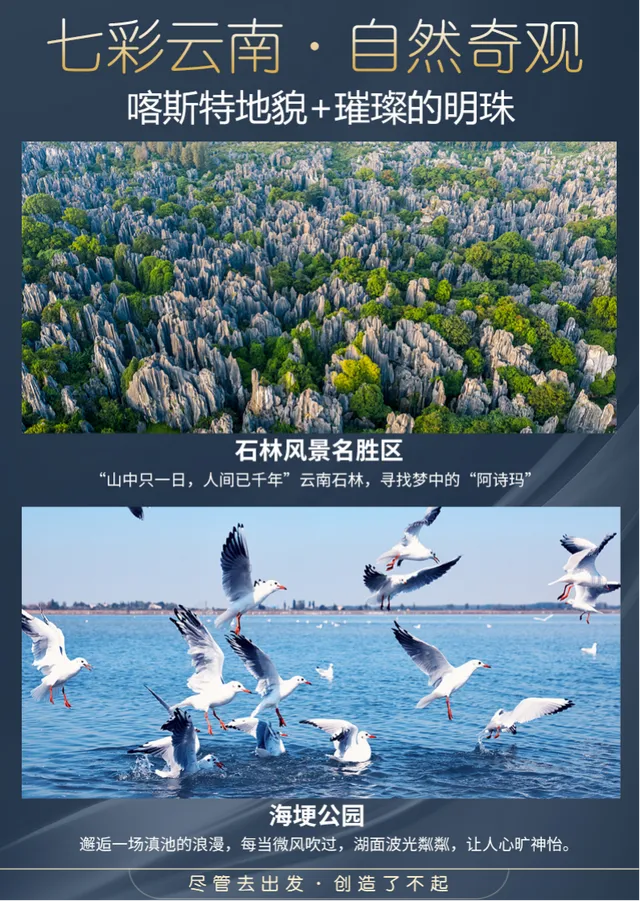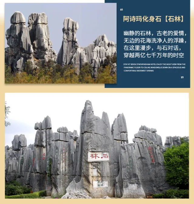 酒店早餐后,乘车前往【石林风景名胜区】(游览时间120分钟,石林电瓶车25元/人已含):国家5A级风景名胜区,喀斯特地貌奇迹,阿诗玛的故乡,以其“幽、奇”在世界自然景观中堪称一绝,被誉为“天下第一奇观”;午餐享用【撒尼迎宾宴】。