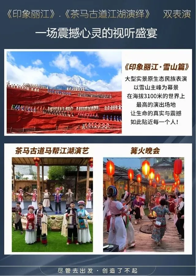 赠送张艺谋导演的大型实景演出【印象丽江·雪山篇】(观赏时间约60分钟),剧场设在海拔3100米的雪山怀抱里,四周高山草甸、白云缭绕,将您带到雪域高原天人合一的纯美实景中,融入以纳西民族为主的当地民俗民风构成的壮美场景中.(如因停演或场次无法安排的情况下更改为《丽水金沙》)。