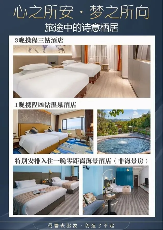 住宿:3晚携程三钻酒店+1晚安宁携程四钻温泉+1晚海景民宿酒店