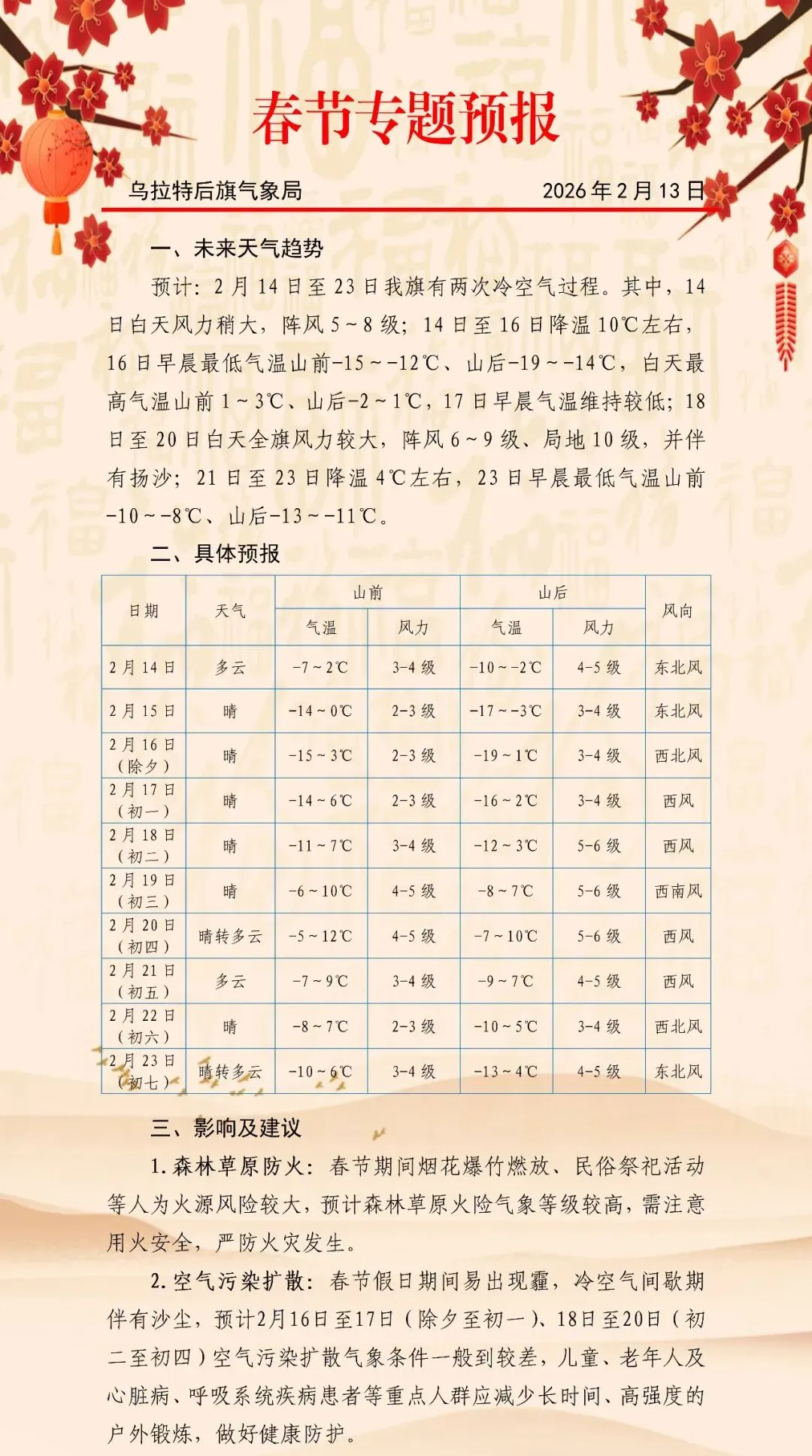 2026年新春佳节将至,“渡·阴山”凭借独特自然风光成为春节热门出游目的地。但阴山沿线地形复杂、气候多变、春季风沙大、路况险峻,安全风险较高。为保障广大游客生命财产安全,度过平安、欢乐、祥和的新春佳节,乌拉特后旗旅游服务中心特提醒广大游客朋友们: