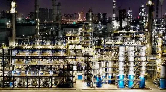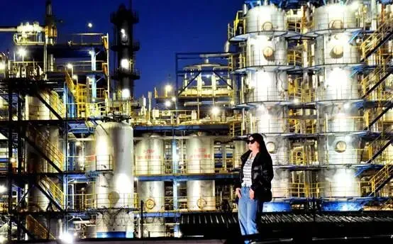 工厂里,高塔耸立,管道蜿蜒,灯光璀璨,场景非常壮观,尽显工业之美。