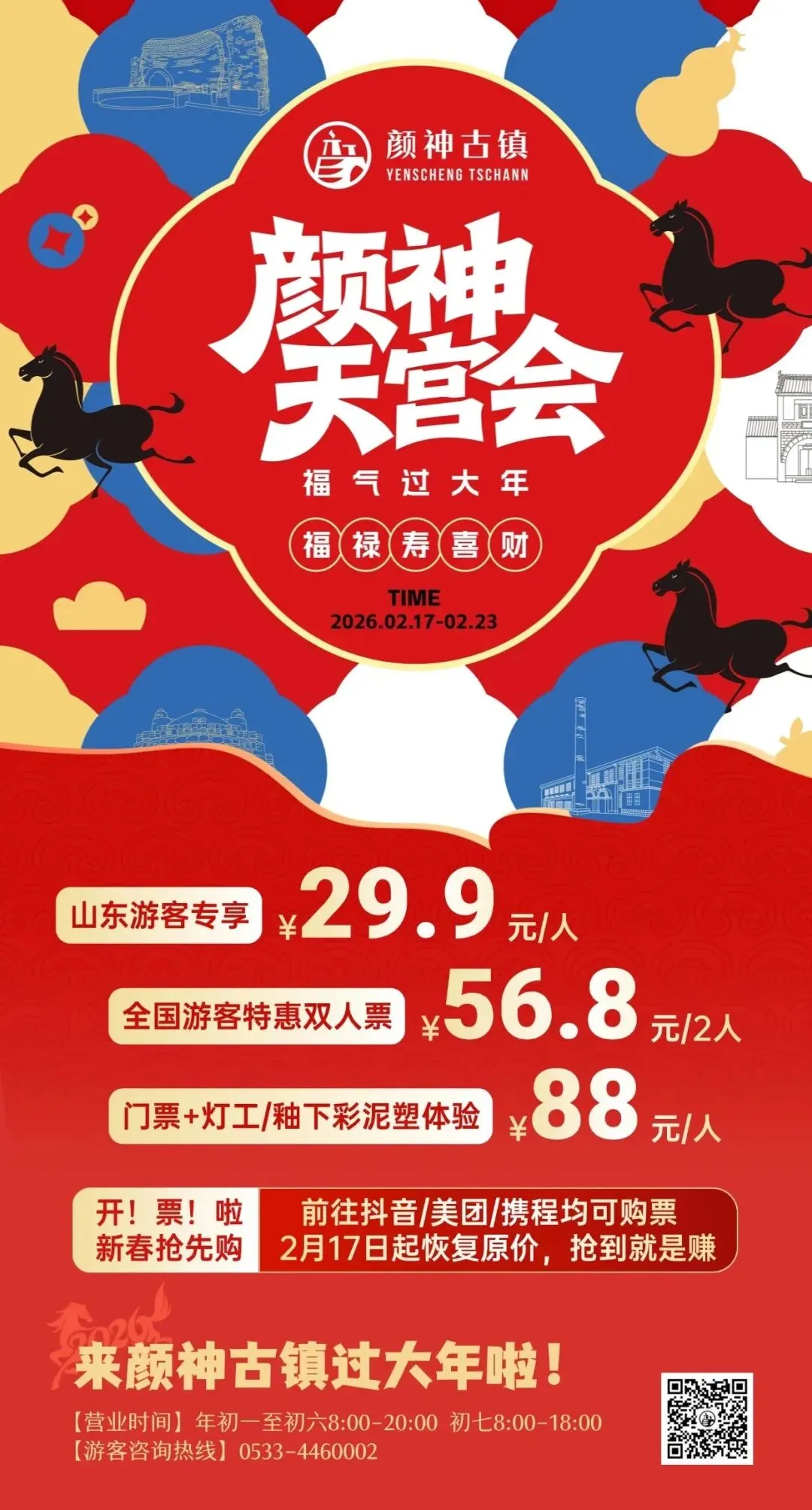 关键词:颜神天宫会,互动演艺,NPC互动,夜游,开窑仪式,琉璃剧场,游园好戏,脱口秀剧场, 优惠:山东游客专享单人票29.9元、全国游客特惠双人票56.8元