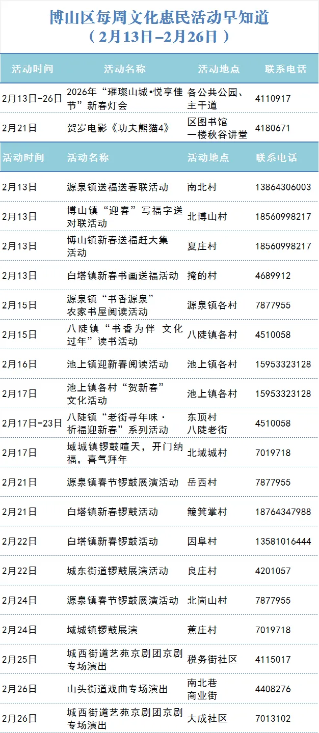博山的新春文旅盛宴仍在火热进行中 区级文化场馆、各镇街村居 重点景区景点、陶琉企业、文博场馆等 推出赏灯、看戏、游园、陶琉手作等活动 这份《博山新春文旅活动预告》 请收藏!