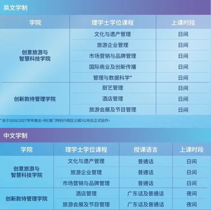 包括酒店、旅游、文化遗产、会展、零售及市场推广、休閒娱乐、康体活动、文化创意及厨艺等。此外,大学亦与国际知名院校合作开办高级管理课程。在调研方面,大学受特区政府及其他机构委讬作旅游规划及发展的政策研究。
