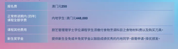 奖学金:澳门旅游大学的奖学金发放对象为报读学位课程的新生,适用于学士、硕士及博士学位课程学生,无须个别申请,由奖学金委员根据学生毕业成绩、入学试成绩或入学文件审查结果等条件甄选得奖学生。