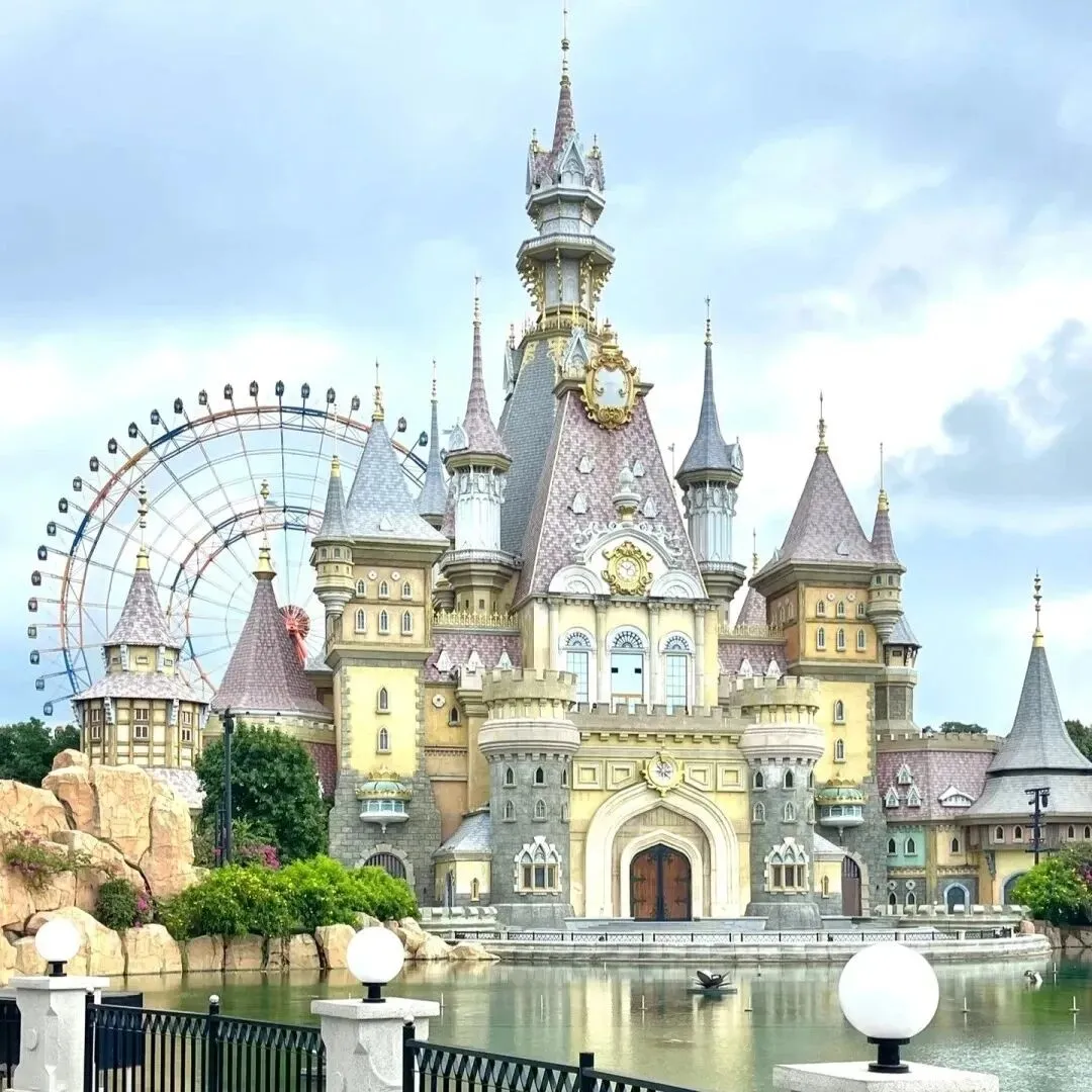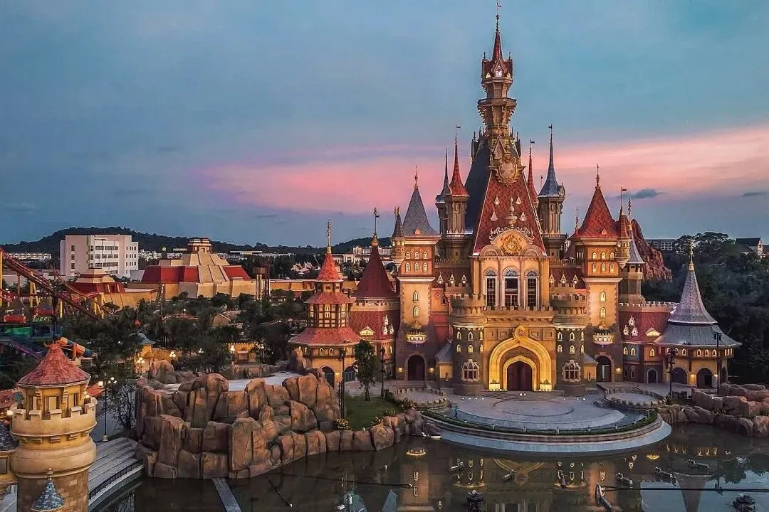 含大型水族馆、过山车、水上乐园与欧式风情街区,夜间城堡灯光秀+烟花氛围感拉满。