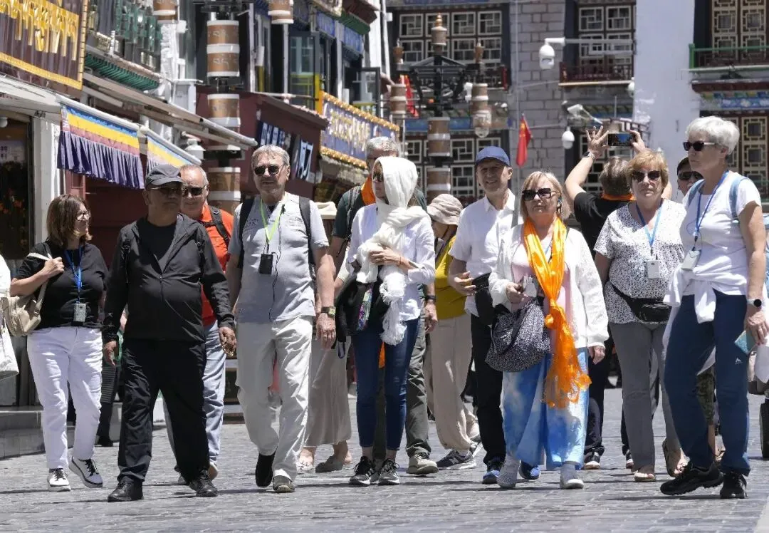 外国游客在西藏拉萨八廓街老城区内游览参观。中新社记者 李林 摄