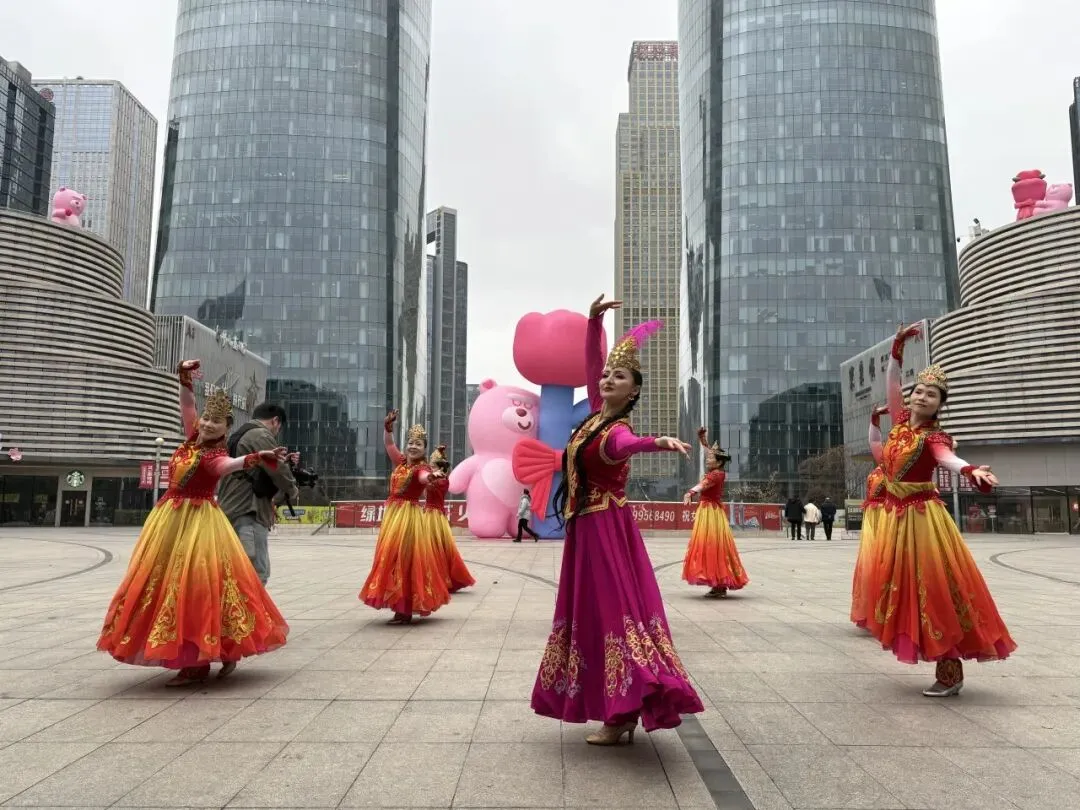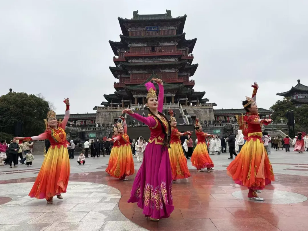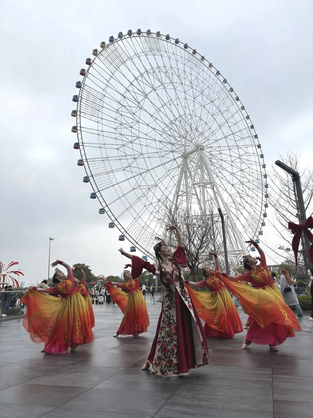 除了室内的教学与汇报展示,本次活动的一大亮点是走出课堂,融入城市。2月7日,在新疆导师的带领下,学员们身着鲜艳的维吾尔族服饰,先后来到滕王阁、双子塔、南昌之星摩天轮等城市文化地标,开展了一系列绚丽夺目的新疆舞快闪活动。
