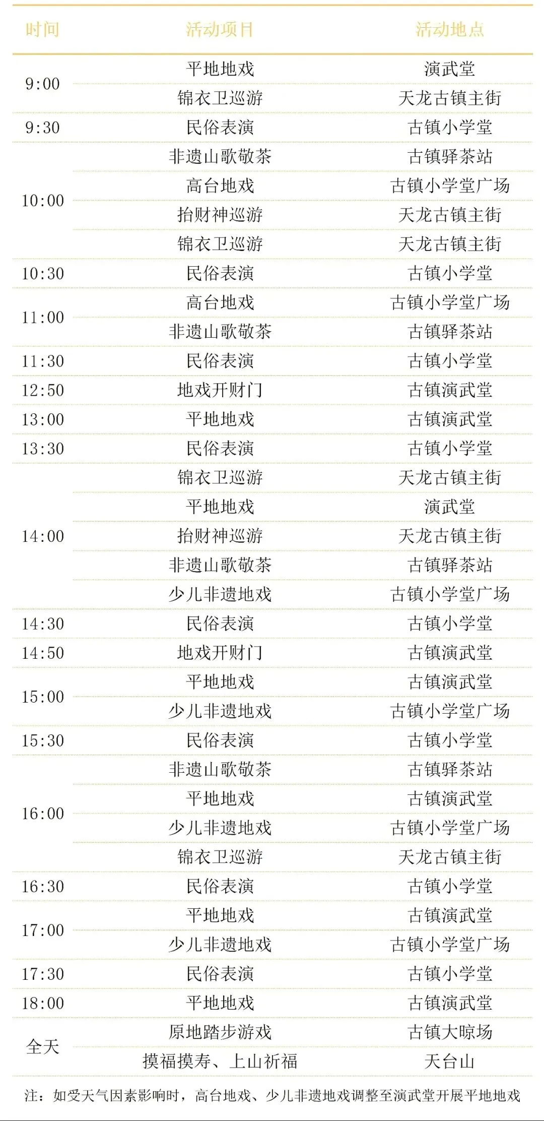 活动亮点:春节期间,每日好戏连台!锦衣卫队列威风巡游古镇,抬财神队伍沿途派发古钱币;着屯堡服饰的非遗山歌对唱邀您互动,派送好礼。更有摸福摸寿等传统祈福活动。非遗地戏展演,地戏开财门邀您着戏服、答问题、赢好礼,带您沉浸式领略传统文化的魅力。“原地踏步”趣味挑战,音乐不停,欢乐不止,节日氛围直接拉满!