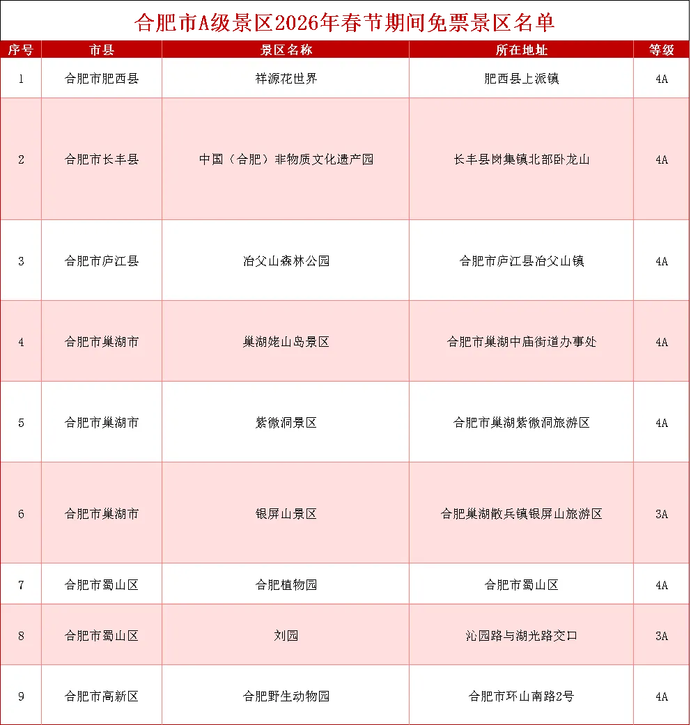 春节假期,凡持有“百戏入皖”门票、来肥机票(火车票)的游客,游览以下9家收费A级景区,可享受首次入园大门票免费优惠。(建议出行前关注景区公众号获取实时动态)。