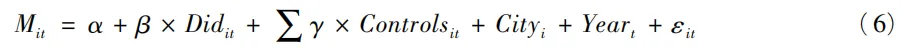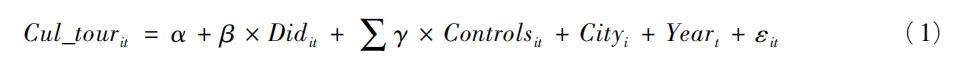 其中,Cul_tourit表示代表第i城市、第t年的文旅融合发展水平,Didit表示文化消费试点城市设立,本文将国家文化消费试点城市设为1,否则设为0;将试点政策实施前后的时间虚拟变量分别设置为0(政策前)和1(政策后),两项交乘后得到Didit。Controlsit代表控制变量的集合。Cityi为城市固定效应,Yeart为年份固定效应,εit为随机扰动项。估计系数β测量了区域文旅融合发展水平在文化消费试点政策冲击前后的平均差异。