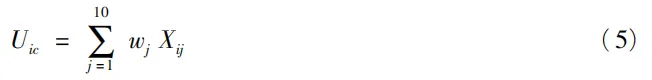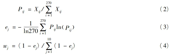 由于所选各项指标的量纲不一致,所以首先需要对样本数据进行无量纲化处理。基于极差标准化法处理后的数据,再采用熵值法确定各指标的权重,计算公式如下: